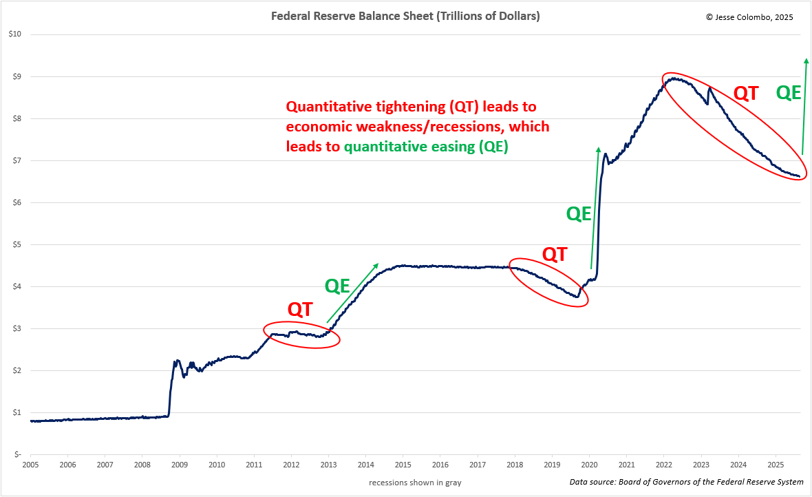Treasuries are also sensitive to economic growth since strong growth often leads to higher inflation and tighter monetary policy from the Federal Reserve. In contrast, weak growth and especially recessions typically cause Treasury yields to decline because they signal falling inflation and looser monetary policy. This is often accompanied by quantitative easing (QE), where the Fed digitally creates money to buy Treasuries, which drives yields down further.