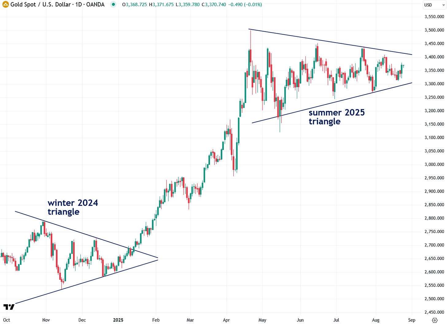 The current volatility squeeze in Treasuries closely parallels the five-month volatility squeeze and triangle pattern forming in gold, which I wrote about last week and strongly recommend reviewing. In fact, the indecision in Treasuries is a major driver of that behavior in gold, since gold takes its cues heavily from U.S. interest rates.