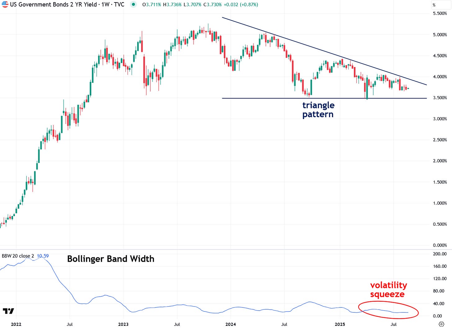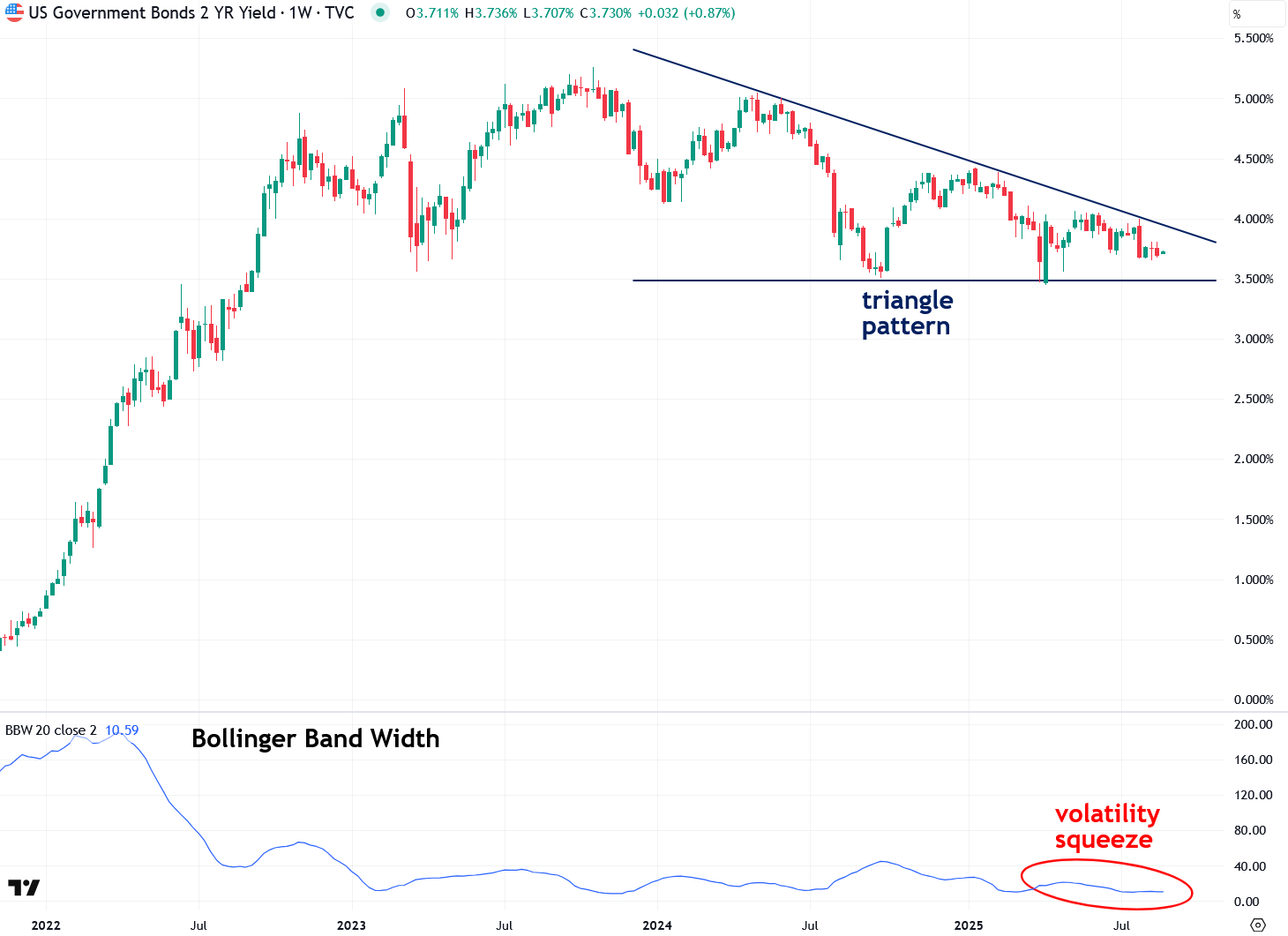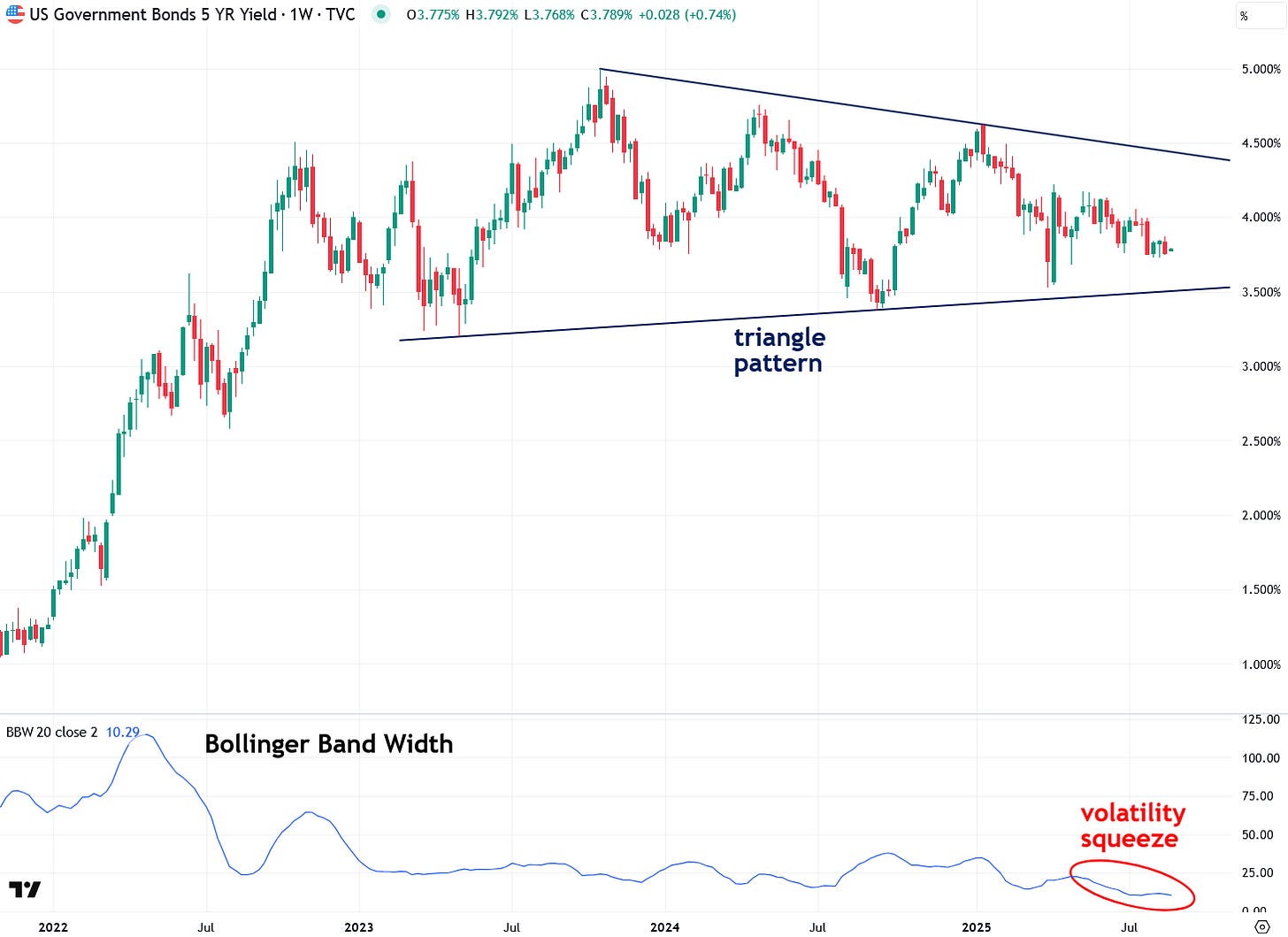 The same triangle pattern and volatility squeeze setup can also be seen in U.S. 5-Year Treasury Note yields: