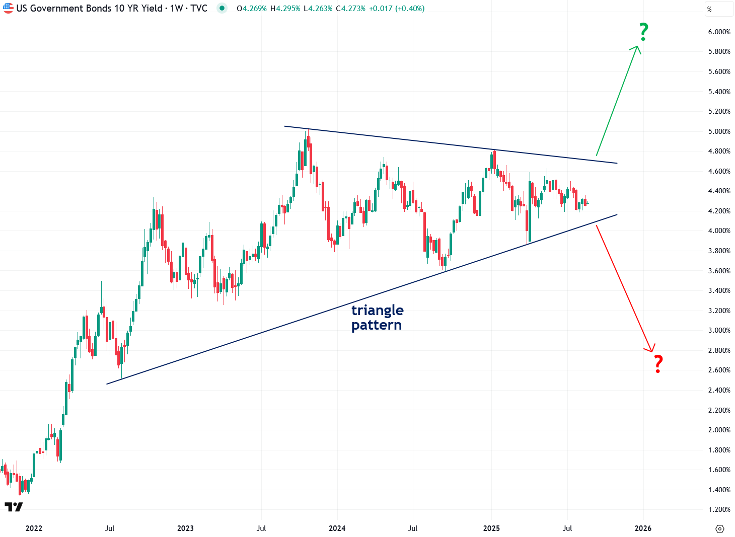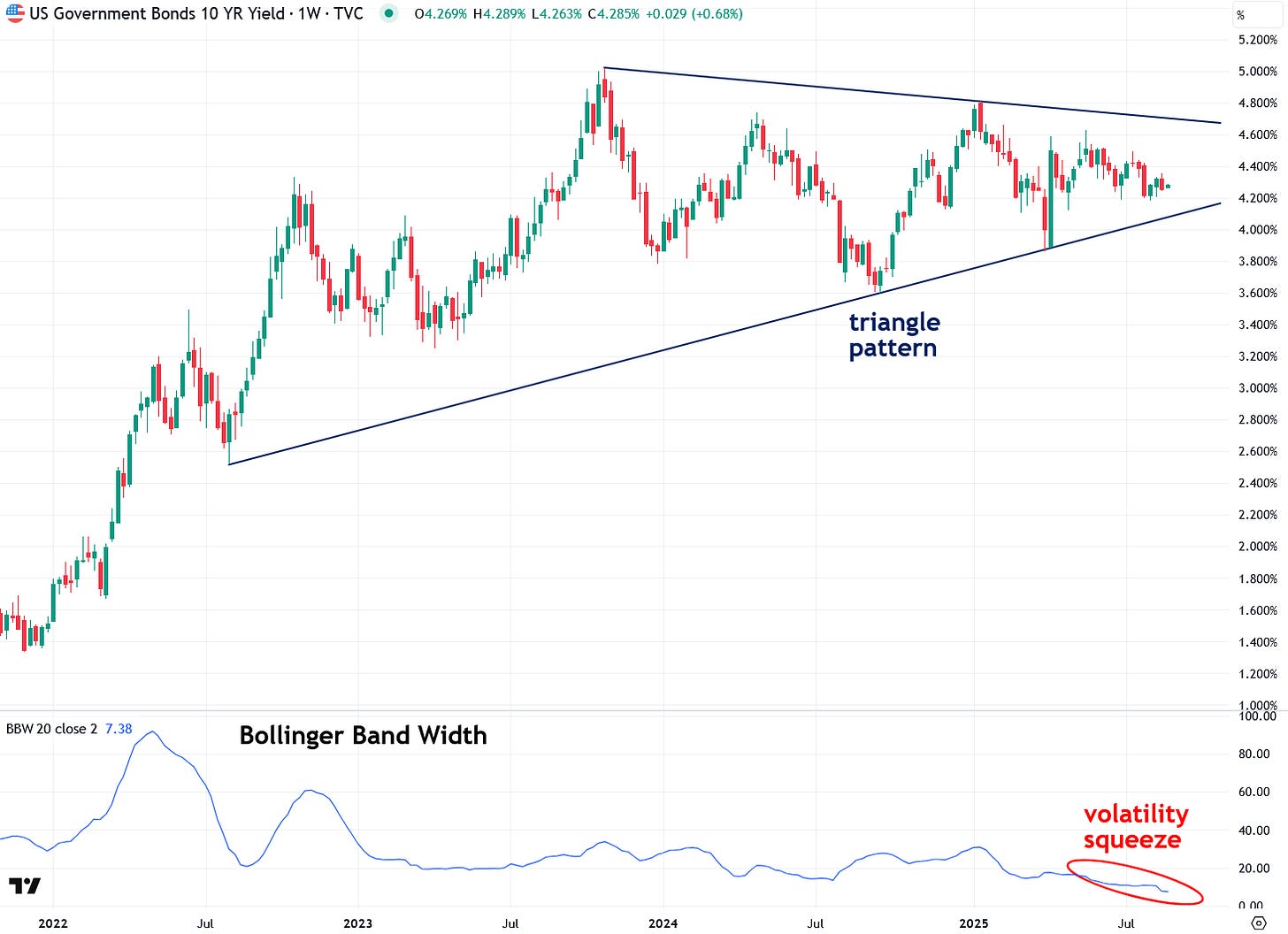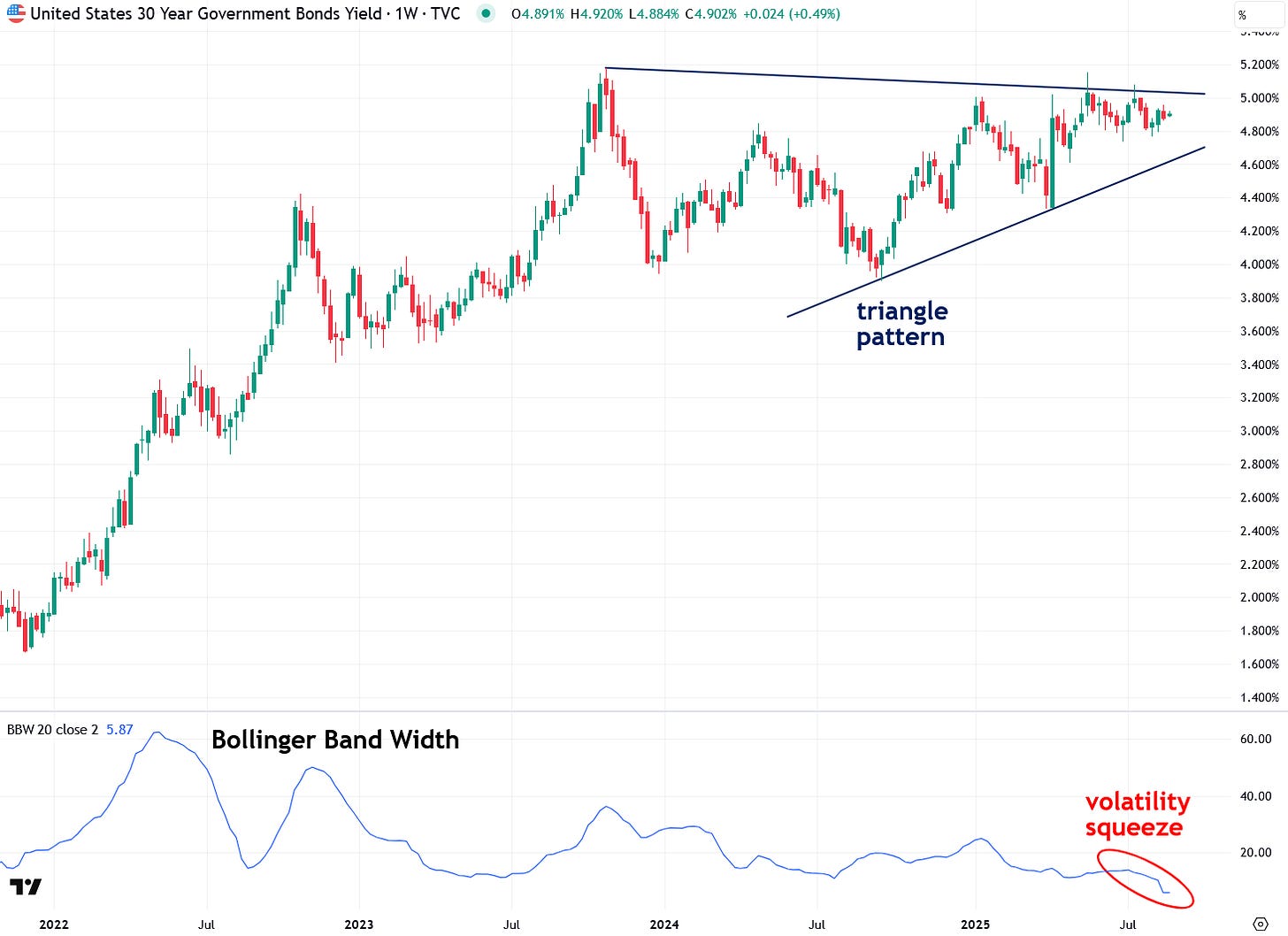 The same triangle pattern and volatility squeeze setup can also be seen in U.S. 5-Year Treasury Note yields:
