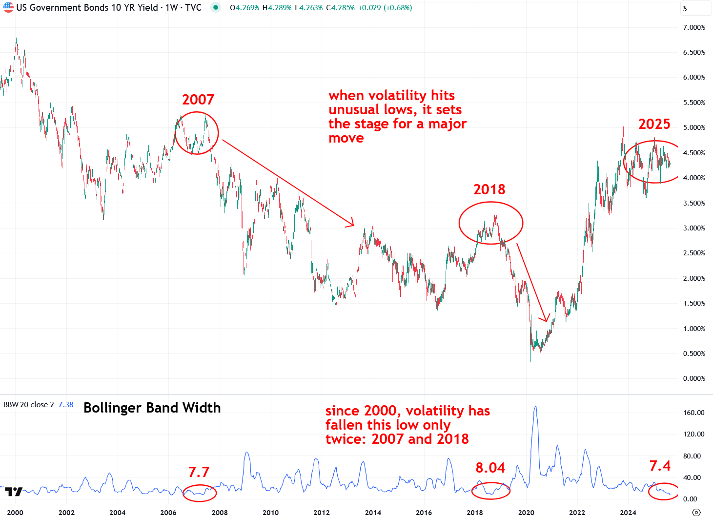 To illustrate just how extreme the current volatility squeeze in U.S. Treasuries is, I created a weekly chart of U.S. 10-Year Note yields going back to the year 2000. According to the Bollinger Band Width indicator, volatility is now at its lowest level in this entire period at 7.4. The only other times it came close were in 2007 (7.7) and 2018 (8.04), and both of those periods were followed by major moves in interest rates. I believe another significant move is approaching very soon.