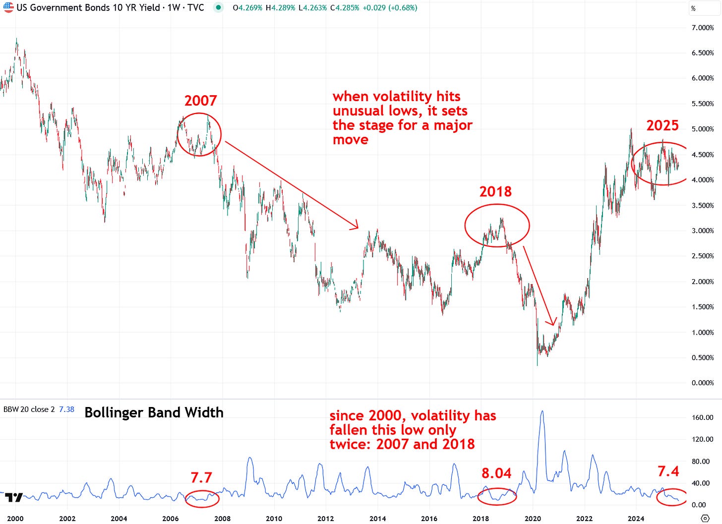 It is important to note, however, that while the last two episodes resulted in falling yields, a volatility squeeze does not indicate direction. It only signals that a large move is ahead. I will address the likely direction shortly, but for now, focus on the highly unusual nature of this volatility setup.