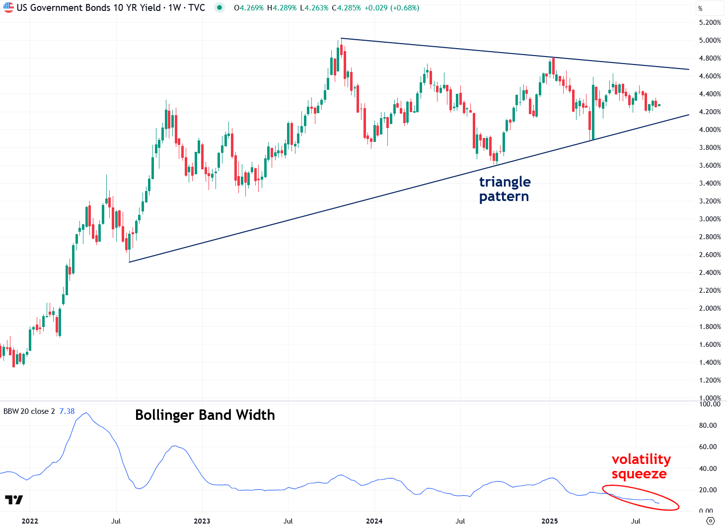 The most important and closely watched bellwether of the Treasuries complex, the 10-Year Note yield, is also showing a triangle pattern and volatility squeeze setup: